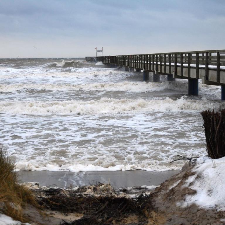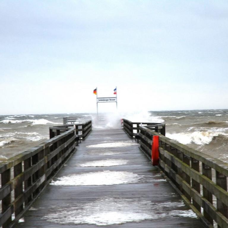 Das Sturmtief Daisy zieht über Deutschland und treibt die Ostsee bei sehr starken Nordostwinden direkt auf den Deich am Schönberger-Strand. Im Hinterland gibt es viele Schneeverwehungen und einige Straßen sind nur schwer passierbar. Der Schönberger-Strand ist komplett unter der Brandung der Ostsee verschwunden. Nur wenige Mutige trauen sich bei diesem Wetter auf die Seebrücke, an der sich die Ostsee bricht und die Gischt meterhoch zwischen den Balken der Brücke spritzen läßt.